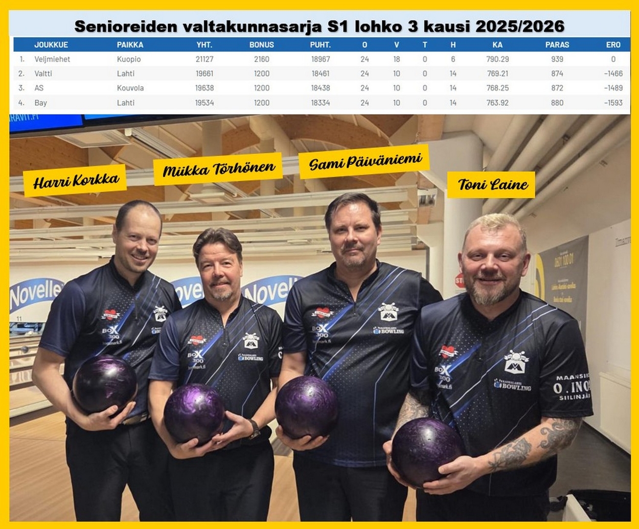 Päivän tuloksena oli vankka kärkipaikka lohkon 3 sarjataulukossa yli kuudensadan pisteen marginaalilla. Seuraavat kolme joukkuetta ovat takana parinsadan pisteen haarukassa järjestyksessä Bay, Valtti ja AS. Sarjan lohkovoittajat pääsevät keväällä karsimaan paikasta mestaruussarjaan, mutta pannaanpas nyt kiviä taskuun ettei lähdetä lentoon. Sarja on vasta puolivälisssä ja seuraava kierros keilataan marraskuun lopulla Kuusankoskella ja kauden viimeinen tamikuun lopulla Lahdessa.