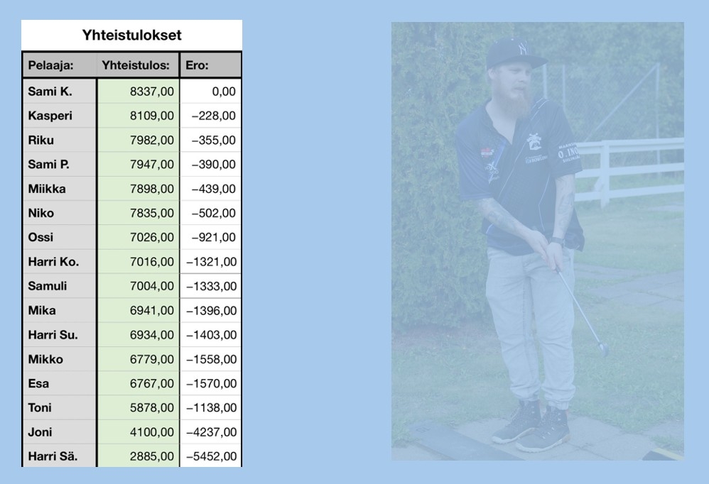 Tiukaksi pistetaisteluksi äityneen Frisbee golfin voitti Riku Karhunen ja kakkosijan jakoivat tasatuloksella Joni Törhönen ja Juha Heiskanen. Loppuratkaisut nähtiin minigolfissa, jonka voitti Miikka Törhönen pisteen erolla Juha Heiskaseen. Kolmanneksi golfasi Harri Korkka.
